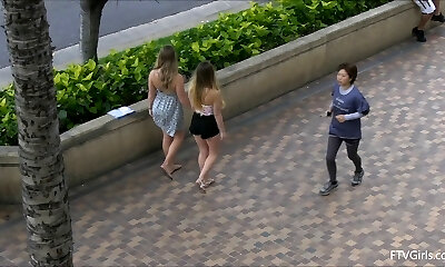 Naughty Hotties In Waikiki wearing sexy dresses are without pants as they wank on public